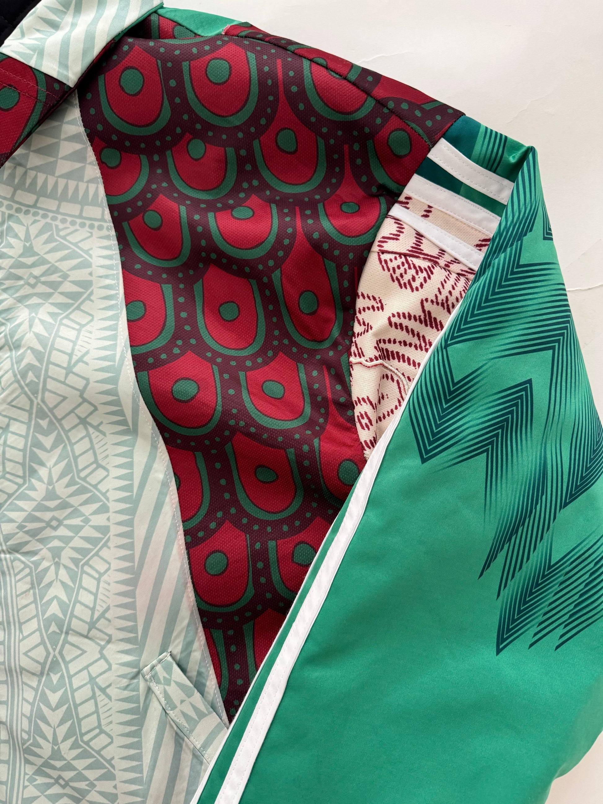 THE MX JACKET WAS UPCYCLED USING MEXICO JERSEYS. LINNED WITH NYLON QUILTED FABRIC.